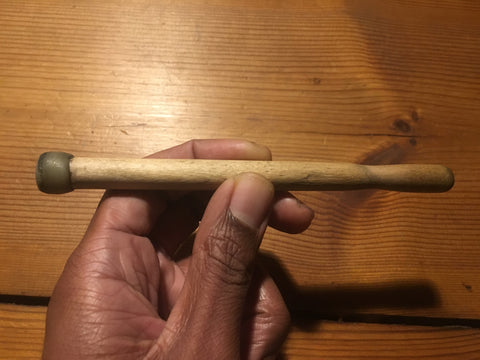 The thickness of the rubbers on the end of one's sticks is crucial in achieving the best overall sound of of a pan, especially tenor pans, which possess the smallest (highest) notes. If the rubber on one's sticks is too thick, the high notes on a tenor are dampened when struck and do not ring. On the other hand, if the rubbers are too thin, one will emit a screeching, unpleasant sound of wood on metal (if wooden sticks are being used), which is important to keep in mind if one plays professionally and is constantly wearing out rubbers due to extended playing time. Wooden sticks can also be worn down too. Here is a stick that has a rubber that will soon be in need of replacement, and where the wood on the grip section has been heavily worn down due to literally thousands of hours of playing: